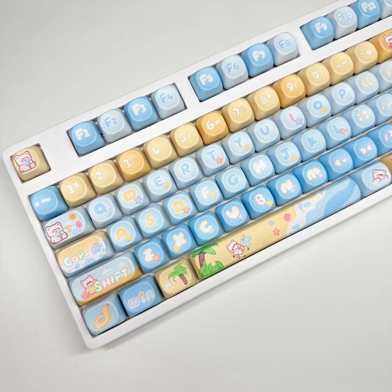Introducing our Summer Holiday Kitty Keycap Set! Bring a touch of the beach to your keyboard with these cute blue sea and golden beach-themed keycaps. Perfect for adding a playful twist to your typing experience. Cat lovers and beach-goers alike will love this quirky addition to their keyboard setup.